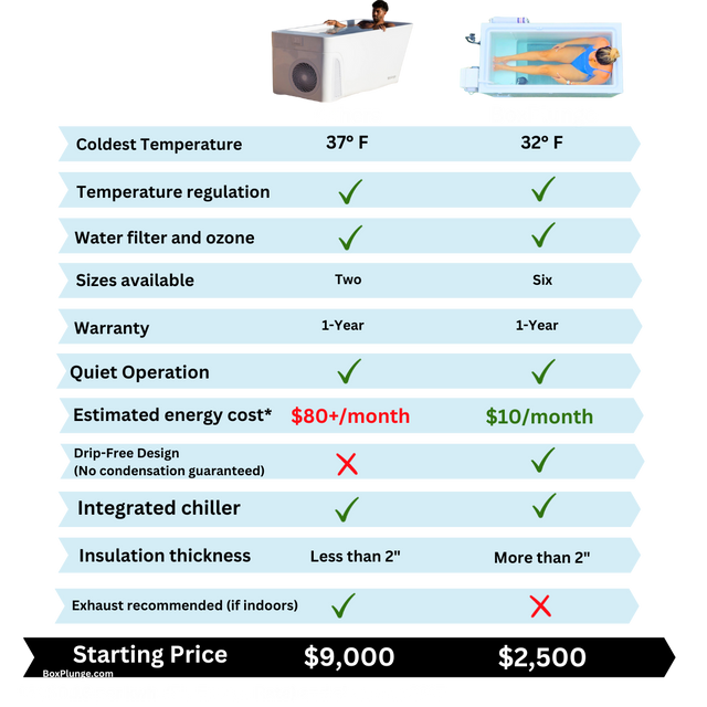 Unlike other cold plunge systems that rely on chillers to extract heat from the water via a heat exchanger and a fan, BoxPlunge passively radiates heat through the outer walls of the freezer, providing a simpler and more energy-efficient solution.